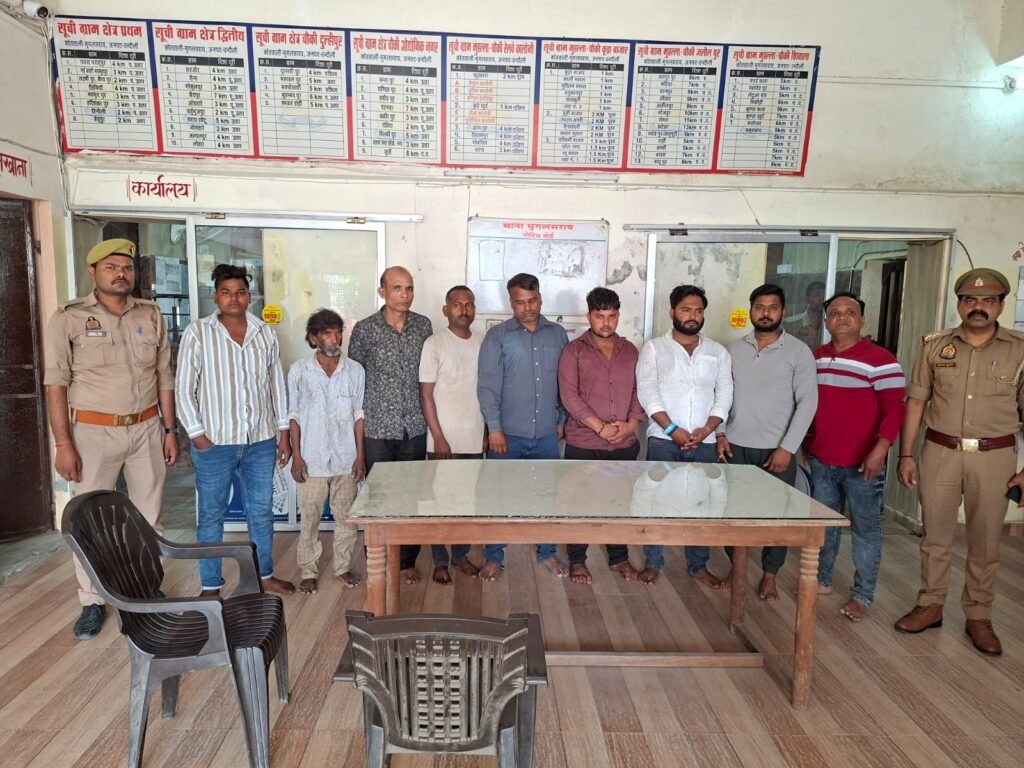 गिरफ्तार अभियुक्तों में महफूज पुत्र मकबुल निवासी सीके 50/08 हकाक टोला थाना चौक जनपद वाराणसी, मो0एजाज पुत्र मो0 रज्जाज उम्र 42 निवासी सीके50/49 हकाक टोला थाना चौक, बाबू पटेल पुत्र बहादुर पटेल उम्र करीब 59 निवासी ग्राम भोजपुर, सचिन यादव पुत्र गुड्डू यादव उम्र करीब 19 निवासी ग्राम फूलवरिया गेट न0- 5 थाना कैण्ट जनपद वाराणसी, दीपक कुमार पुत्र अलखनाथ यादव उम्र करीब 32 निवासी पुराना रामनगर थाना रामनगर, अमर पटेल पुत्र सीताराम पटेल उम्र 31 निवासी पुराना रामनगर थाना रामनगर, उमेश गिरी पुत्र इन्द्रजीत गिरी उम्र करीब 48 निवासी ग्राम भोजपुर थाना मुगलसराय, विकास सोनकर पुत्र अमरनाथ सोनकर उम्र करीब 30 निवासी बडी गैबी विनायका, अंग्रेजी शराब की दुकान ग्राम ग्राम भोजपुर, सोनू सोनकर पुत्र भैयालाल सोनकर उम्र करीब 28 निवासी 34/100 गोलगड्डा थाना आदमपुर।