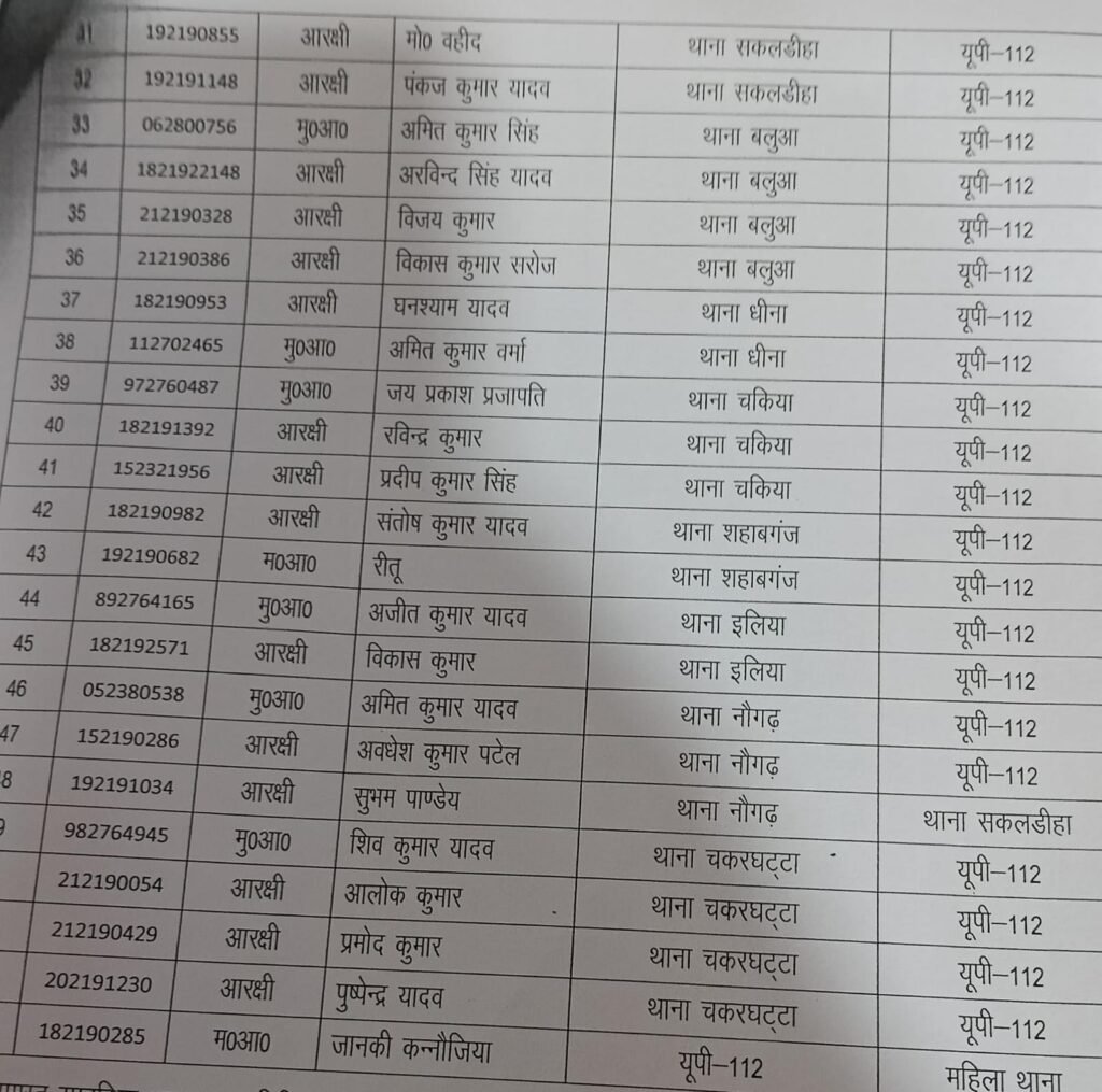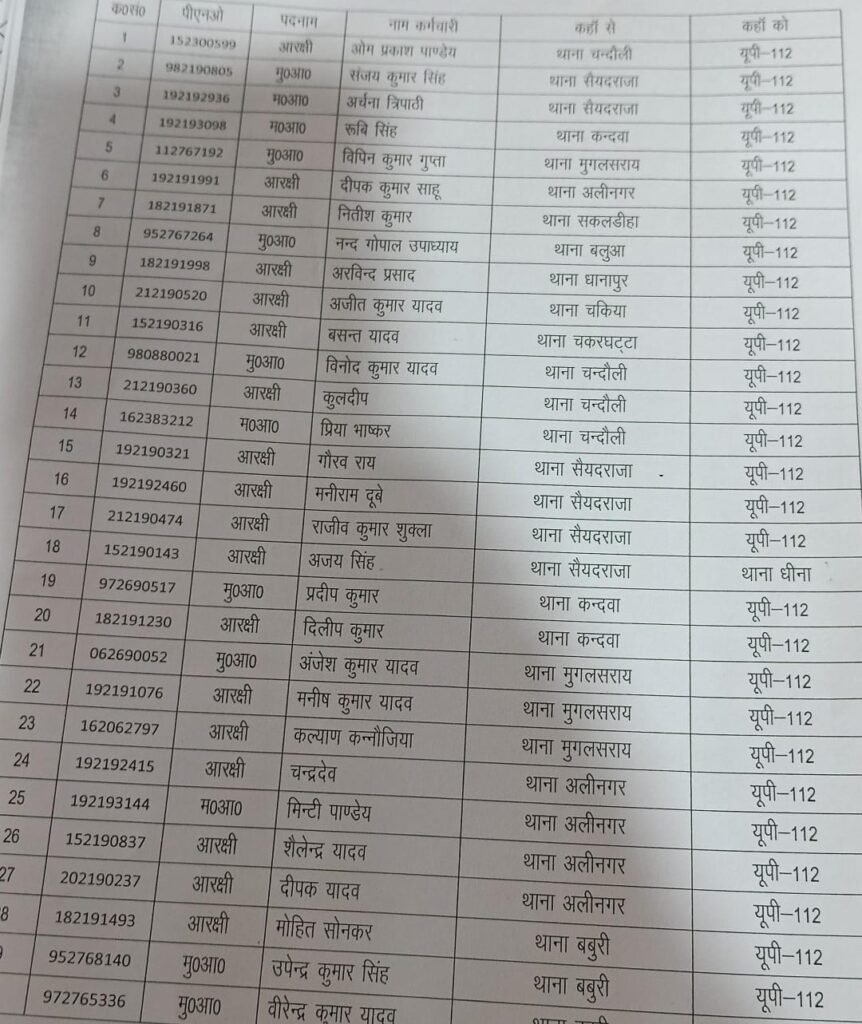 इसमें चंदौली कोतवाली में तैनात ओमप्रकाश पाण्डेय को डायल 112 में भेजा गया है। अलीनगर, मुगलसराय, सैदराजा, कंदवा, नौगढ़, चकरघट्टा जैसे अन्य थानों से कुल 55 कर्मचारियों की तैनाती की गयी है।