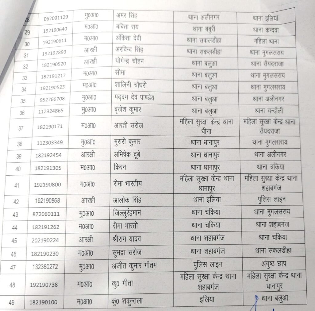 चंदौली थाने के मुख्य आरक्षी देवेंद्र कुमार गुप्ता को इलिया भेजा गया। जबकि श्याम कुमार यादव को लाईन हाजिर कर दिया गया। गौरव शुक्ला को बलुआ थाने भेजा गया। सैदराजा के दो मुख्य आरक्षी जयप्रकाश को शाहबगंज व शिवशंकर विन्द को धीना भेजा गया। आरक्षी राहुल को मुगलसराय, रामबाबू को बलुआ, कारखास रहे देवेंद्र मौर्या को सकलडीहा व गुंजन को इलिया भेजा गया। महिला सुरक्षा केंद्र सैदराजा कि दोनों कर्मचारियों पूजा को अलीनगर व निरंजन को महिला थाना भेज दिया गया। कंदवा से सुप्रिया पटेल को सकलडीहा व अंजलि को महिला थाना। महिला थाना से सुनीता यादव को मुगलसराय भेजा गया शैल कुमारी को महिला सुरक्षा केंद्र धीना, सत्य पाण्डेय को धीना से महिला सुरक्षा केंद्र सैदराजा, नीलम को मुगलसराय से चंदौली, रोशन देवी को बबुरी, निधि सिंह को कंदवा, विवेकानंद बघेल को शाहबगंज, विवेक यादव को चन्दौली, अभय को सैदराजा, सलमा कुरैशी को धानापुर भेजा गया।