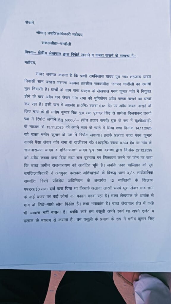 जिसमें 20 हजार नकद और पांच हजार यू०पी०आई० के माध्यम से लिए। पैसा लेने के बाद 14.11.2025 को उक्त मनीष कुमार के पक्ष में रिर्पोट लगाया। इसके साथ ही गांव के खलीहान सं० 610ड़मि० रकबा 0.324 हे० पर गांव के राजनारायण यादव व हरिनारायण यादव पुत्र स्व० दशरथ द्वारा दिनांक 27.12.2025 को अवैध कब्जा करा दिया। इसकी शिकायत करने पर यह जमीन आवंटित बता दिए। जबकि उक्त खलिहान को पूर्व उपजिलाधिकारी ने अवमुक्त कराकर अतिक्रमण कारियों के विरुद्ध 3/5 सार्वजानिक सम्पत्ति अधिनियम के अन्तर्गत 12 व्यक्तियों के खिलाफ एफ०आई०आर० दर्ज कराए थे। इसके बाद भी उक्त जमीनी पर पैसा लेकर कब्जा दिलाया जा रहा। एसडीएम ने लेखपाल पर लगे आरोप का जाँच कराकर कार्यवाही करने का भरोसा दिया।